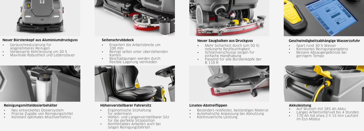Effizient, langlebig und sparsam – mit der B 110 R wird die Reinigung von Großflächen wie Supermärkten, Flughäfen und Lagerhallen jetzt noch komfortabler. Die neu entwickelte Aufsitzmaschine liefert beste Reinigungsergebnisse bei gesteigerter Produktivität. Darüber hinaus sparen sie dank der neu entwickelten Elemente gleich an mehreren Stellen ein, wie zum Beispiel in puncto Zeit, Reparaturkosten und Ressourcen. Die neue Aufsitz-Scheuersaugmaschine von Kärcher zeichnet sich darüber hinaus durch die Verwendung von besonders robustem Material durch ihre Langlebigkeit aus. Diese und viele weitere Vorteile machen das neue Aufsitz-Modell B 110 R von Kärcher zur idealen Ergänzung Ihrer Reinigungsflotte.